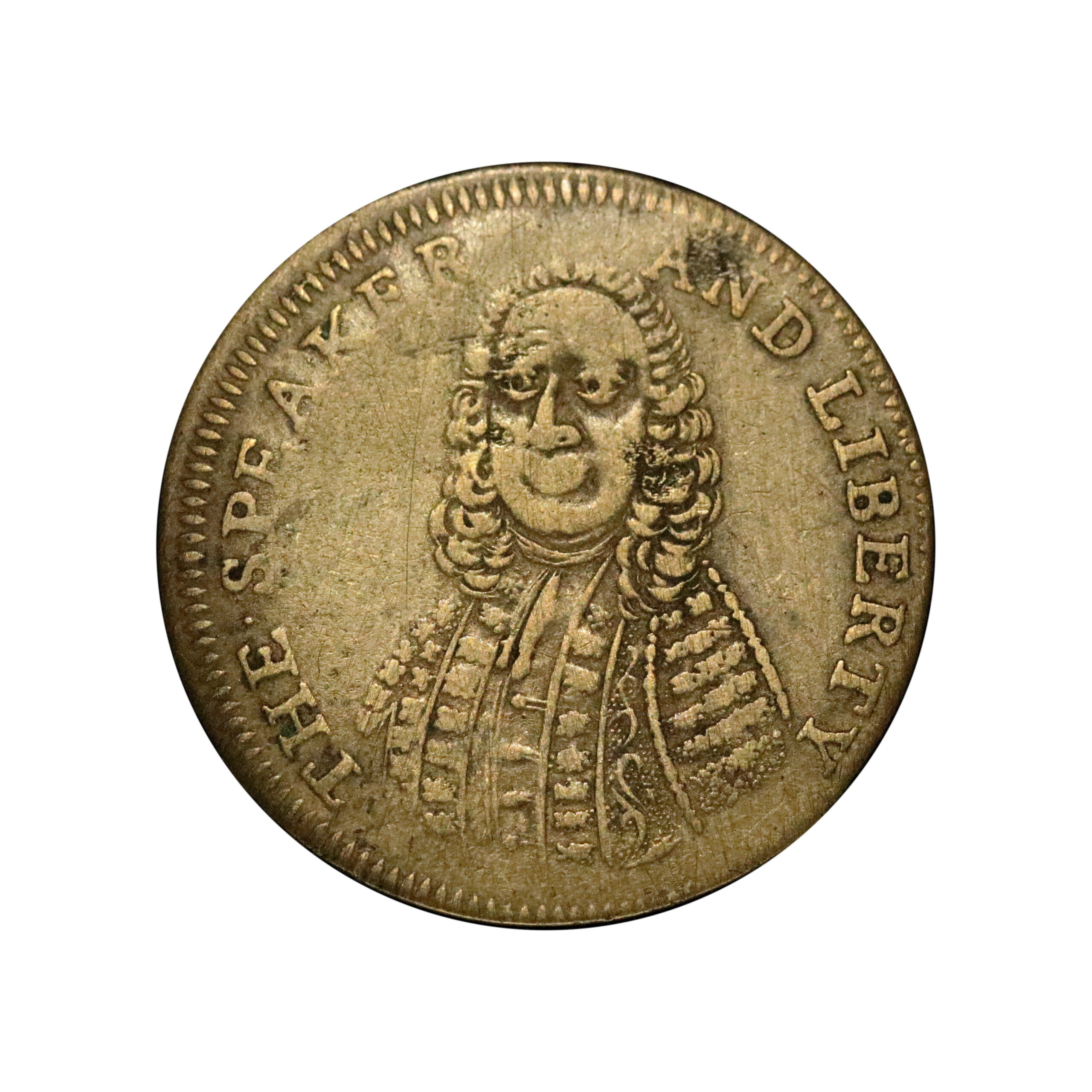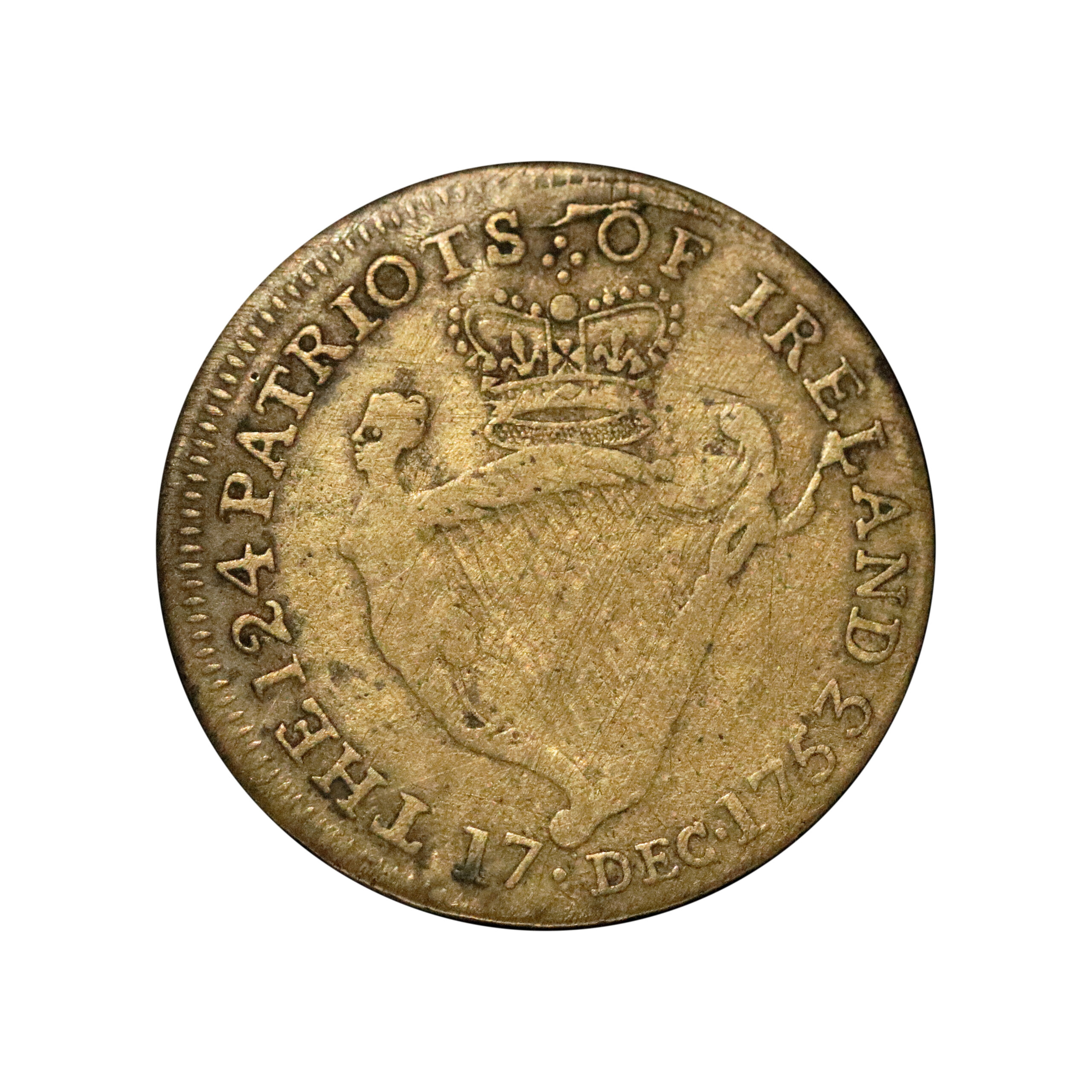George II, Irish Surplus Revenue Dispute; Bust of Speaker, The Speaker and Liberty / The Irish Crowned Harp, 124 Patriots of Ireland 17 Dec 1753. Low relief, MIii 674 / 387, brass, 3.88g/25mm, fine. Rare.