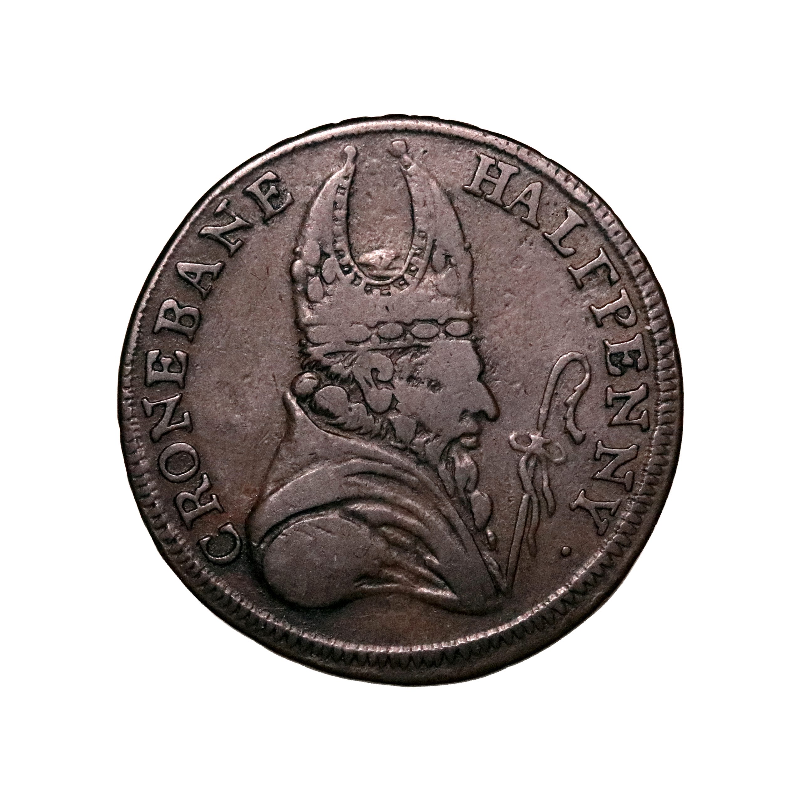 Wicklow, Cronebane, Issuer Uncertain; D&H 54bis, imitation halfpenny struck in copper. Regarded as an unpublished variety in the Deane sale however variety already known with D&H 54bis attribution. A clear and bold example of this rarity, hammering at £250 in the 2022. Very fine. Extremely rare.