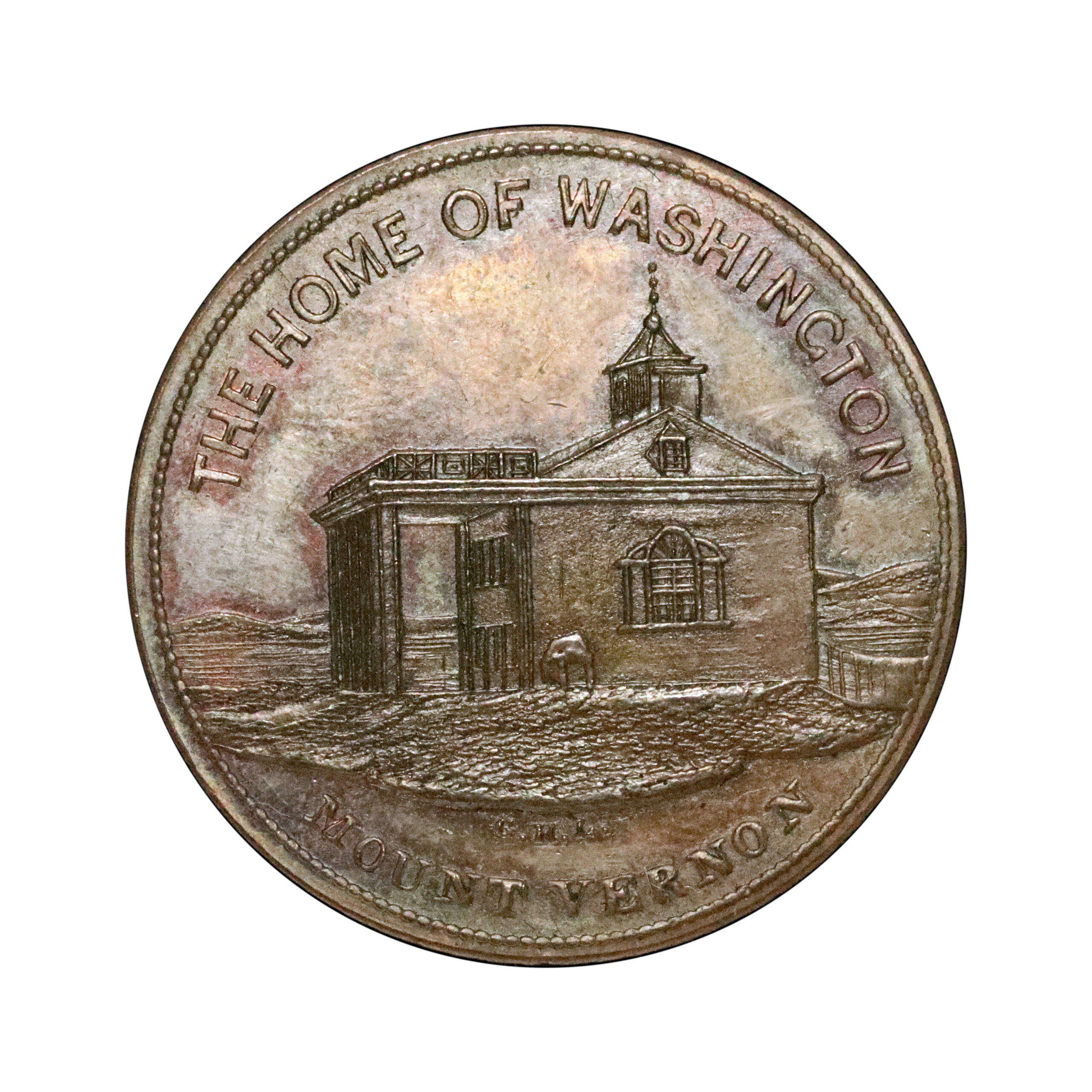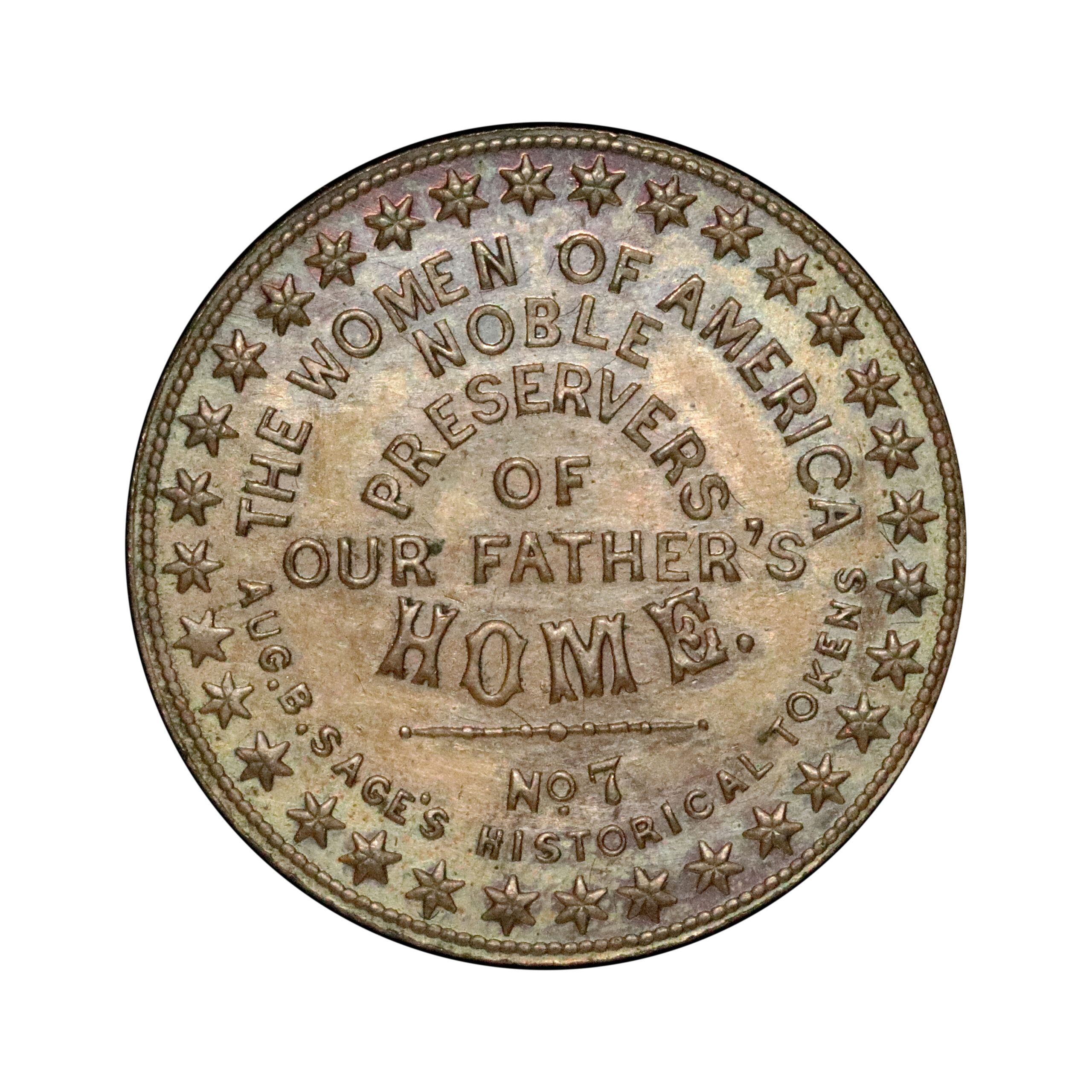 Augustus B. Sage’s, Historical Tokens (c.1860); Washington, copper 11.4g. No.7, The Home Of Washington / The Women of America, etc. Sharp, richly toned surfaces with proof-like fields. Good extremely fine.