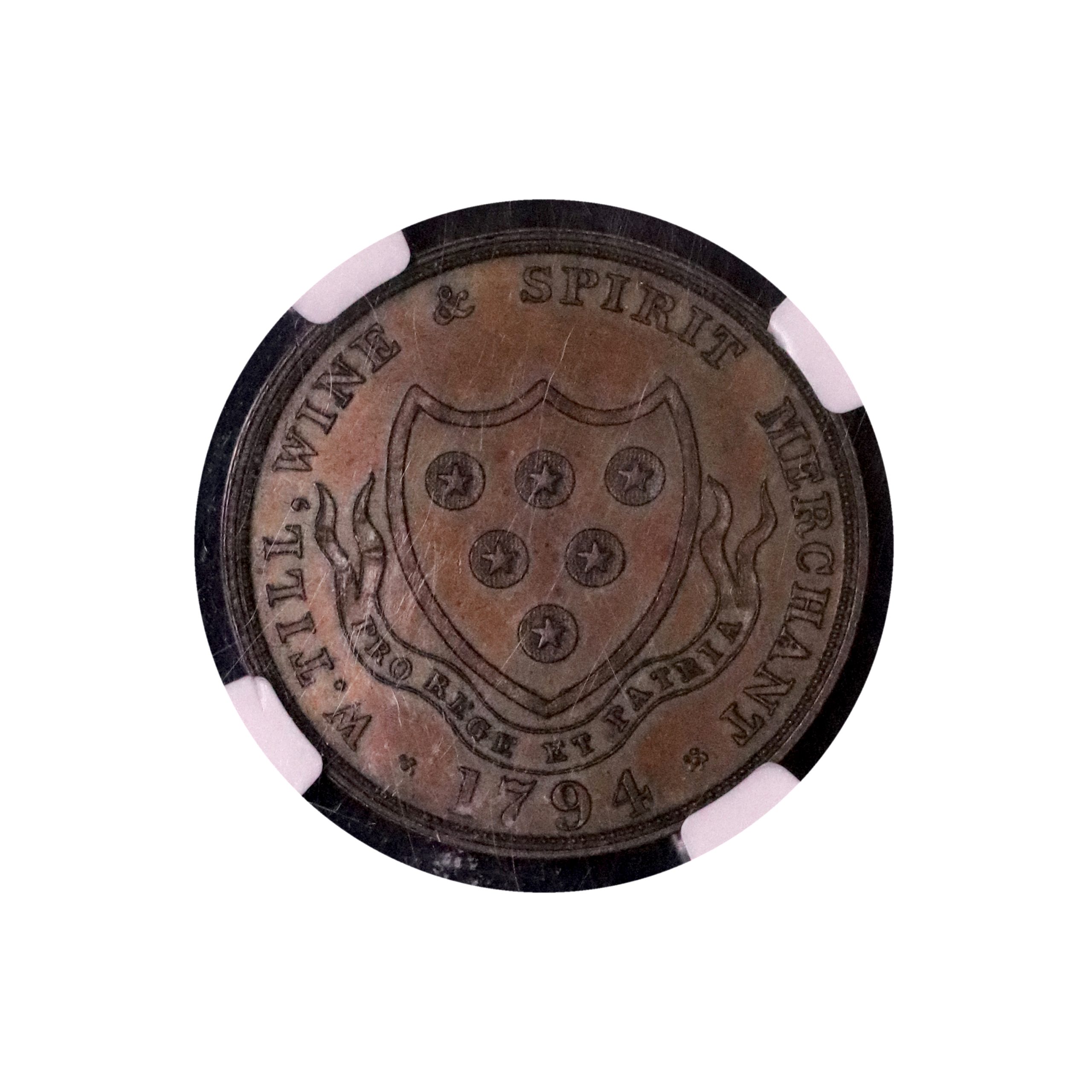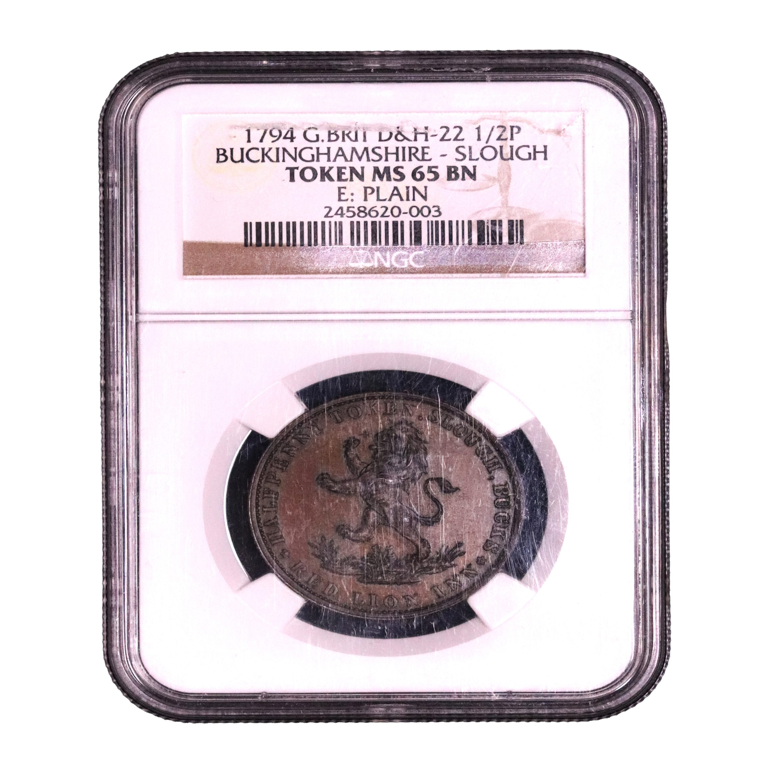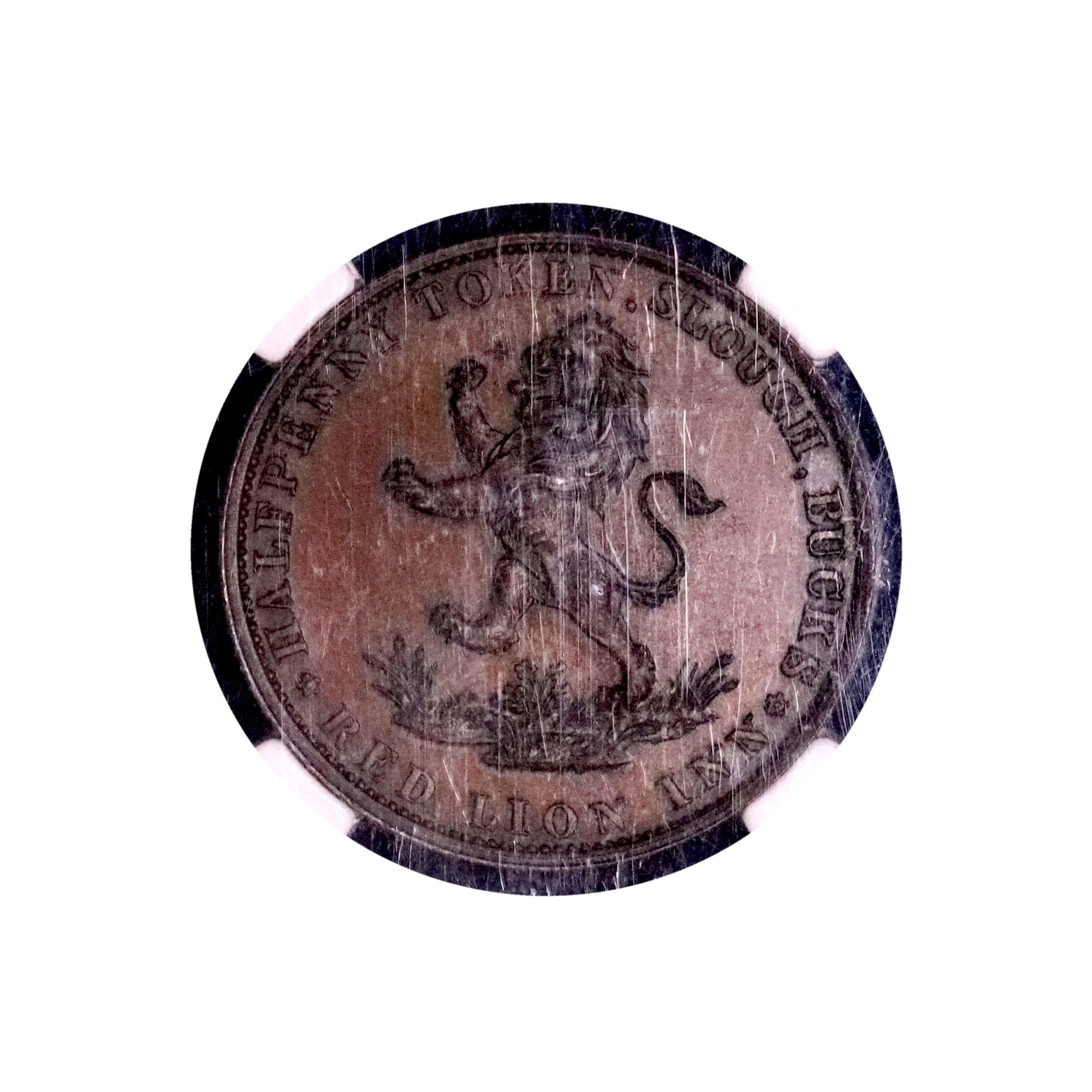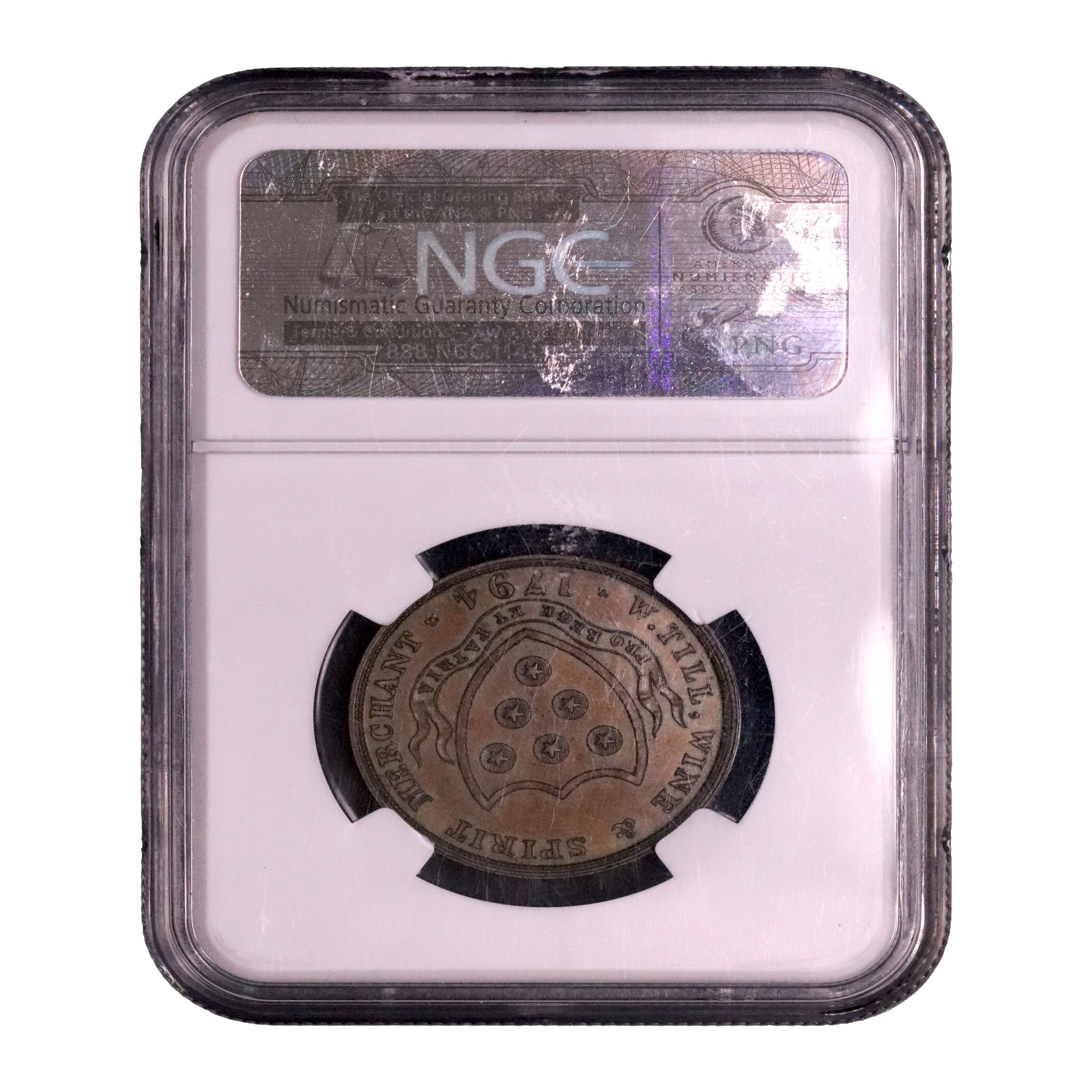 Buckinghamshire, Slough, William Till; D&H 22, halfpenny struck in copper. Crisp and choice example with even chocolate brown surfaces. Mostly as struck and housed in an NGG 65 holder. Scarce.