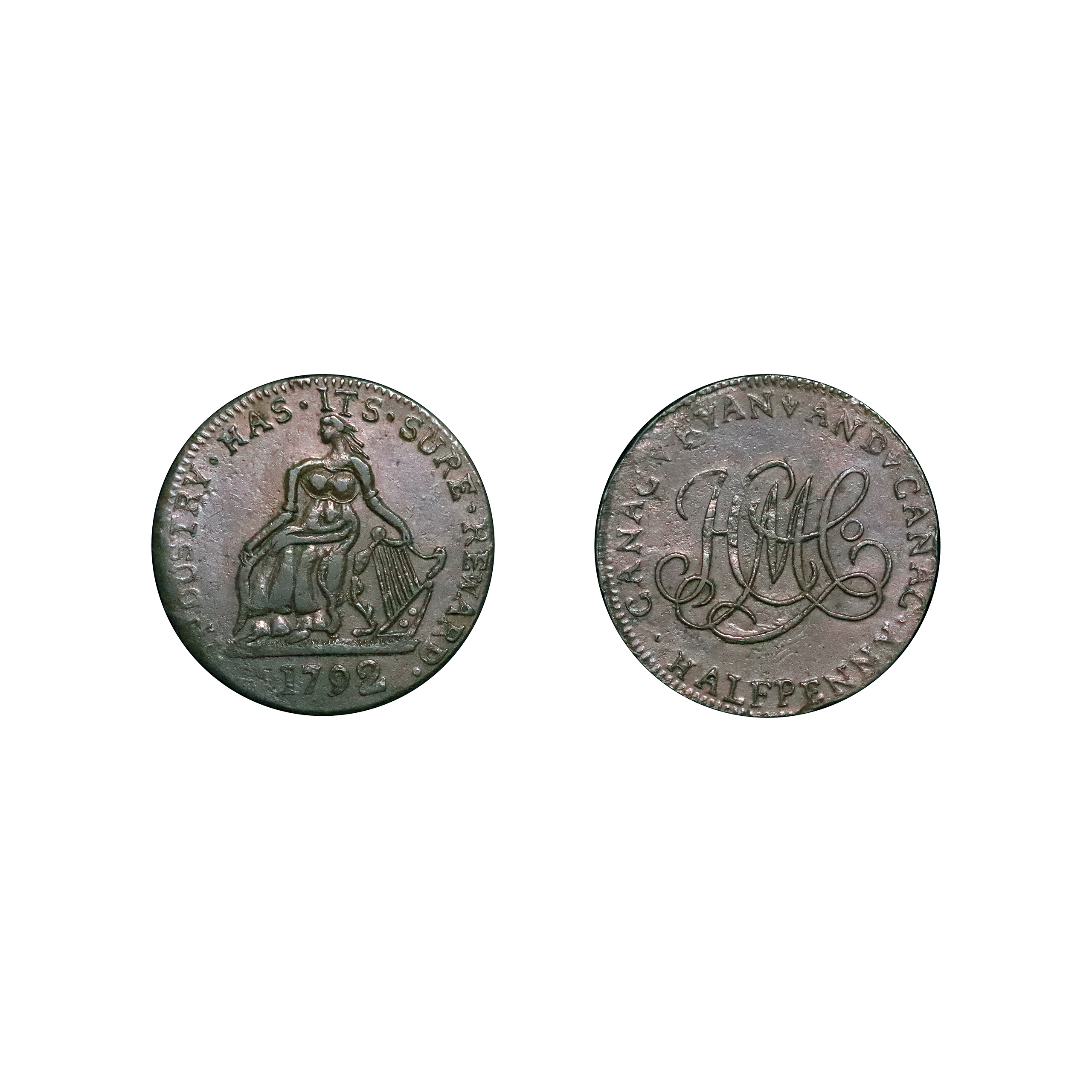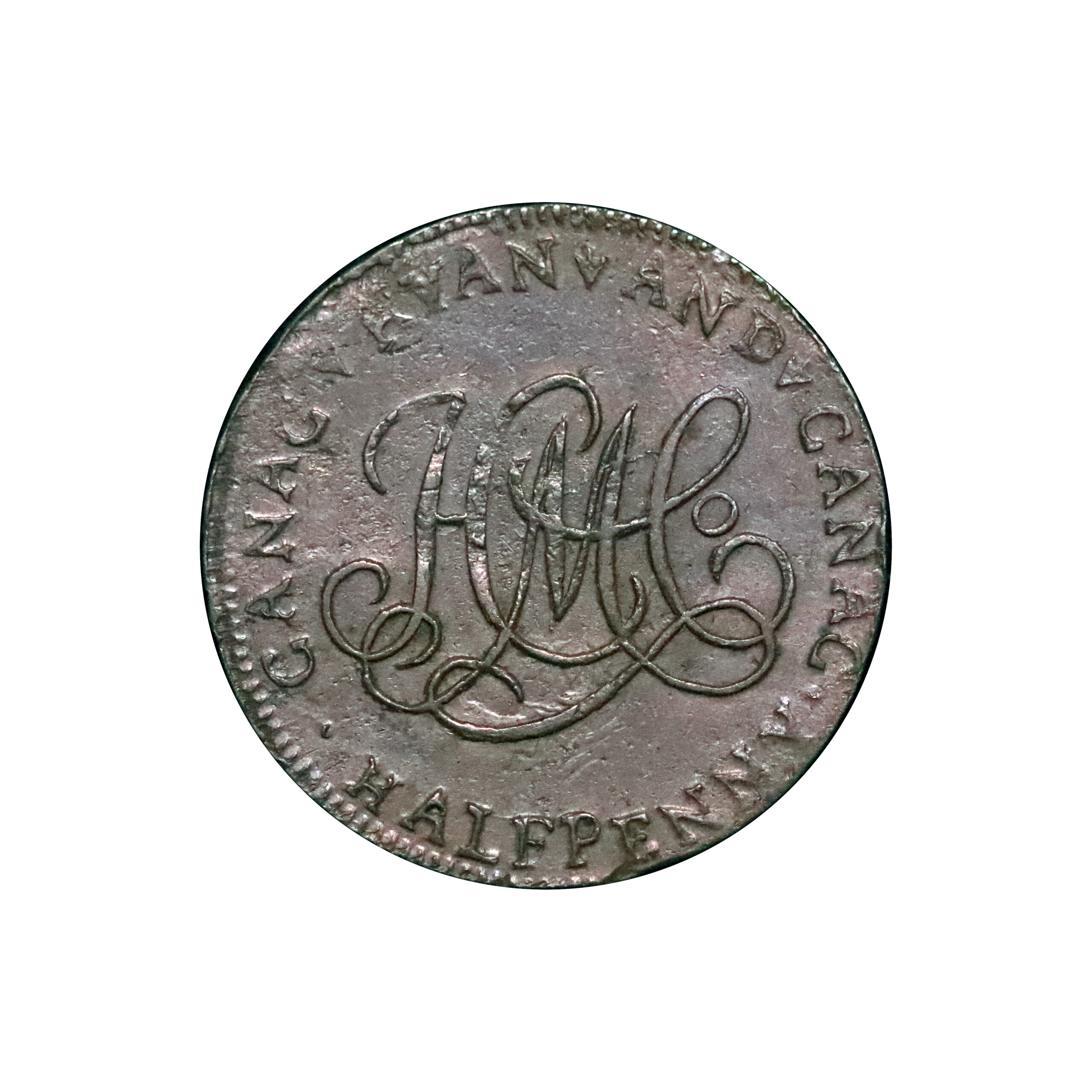 Dublin, Issuer Uncertain; D&H 185, halfpenny struck in copper, 9.01g. Crude imitation, reverse legends as     CANAC RYAN AND CANAC HALFPENNY. One of the more common imitations in uncommon condition. . Good very fine or better for type, scarce.