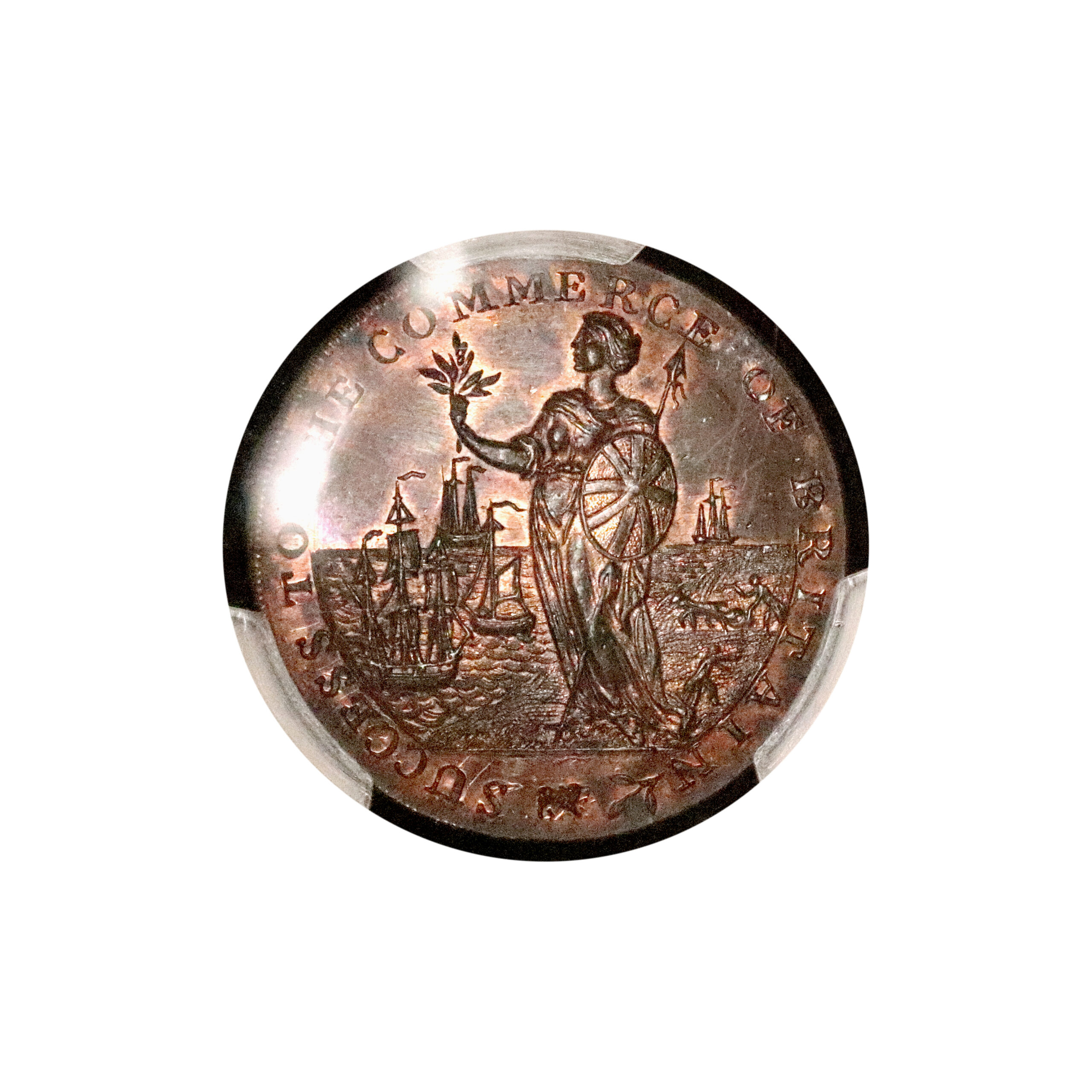 Spalding, Thomas Jennings, D&H 6a, halfpenny struck in copper. Brilliant fields with substantial original colour. Housed within a PCGS MS 66 RB holder, noted as their finest graded, scarce. Virtually as struck.