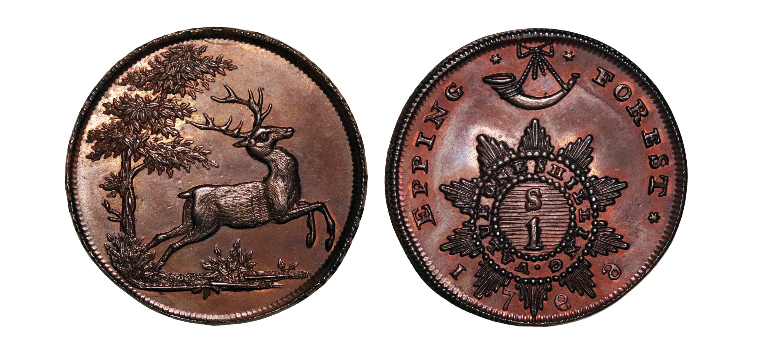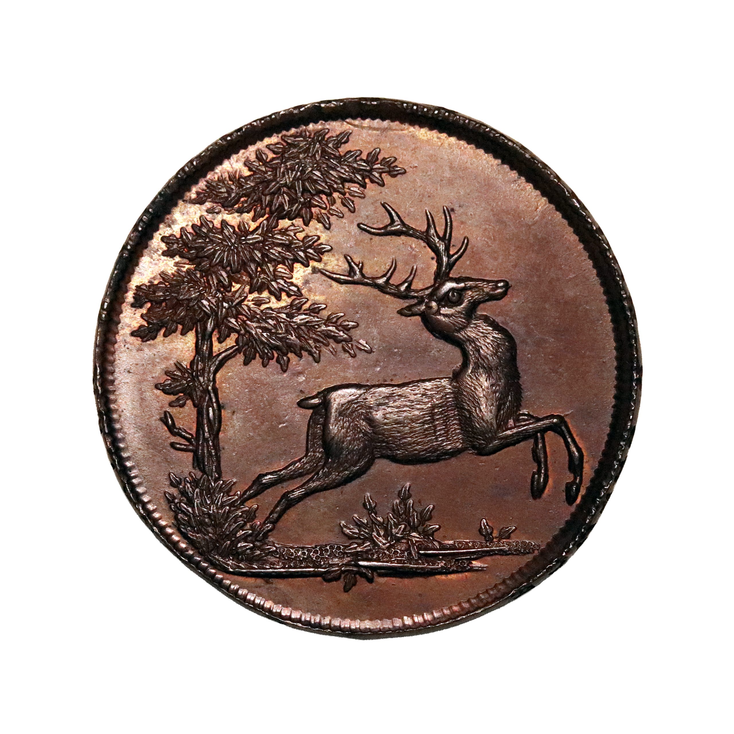 Essex, Epping Forest, Thomas Spence; D&H 1, Spence’s shilling struck in copper. Typical reverse die break otherwise, very sharp – see obverse trees and hair on the Stag very clear. Choice glossy brown surfaces with hints of red. Good extremely fine. Rare.