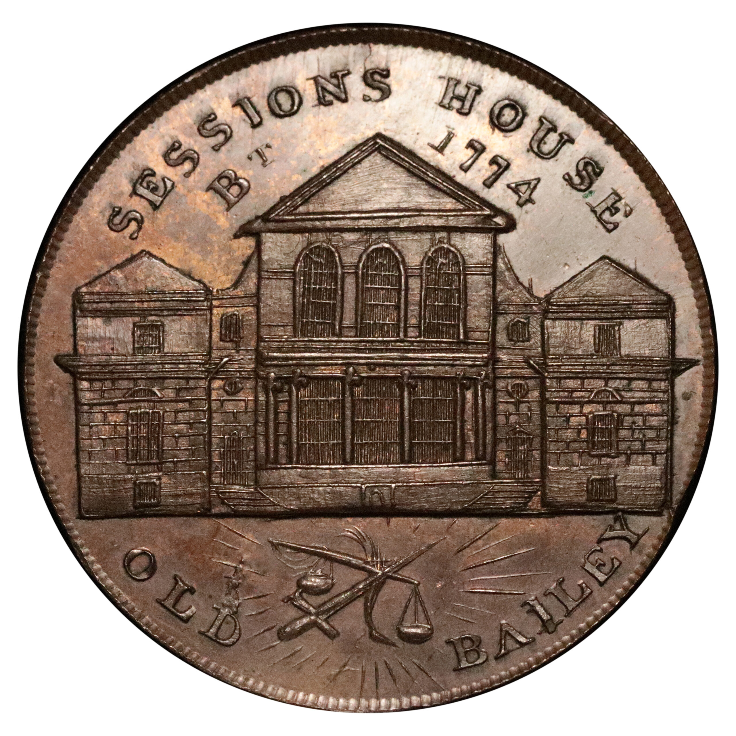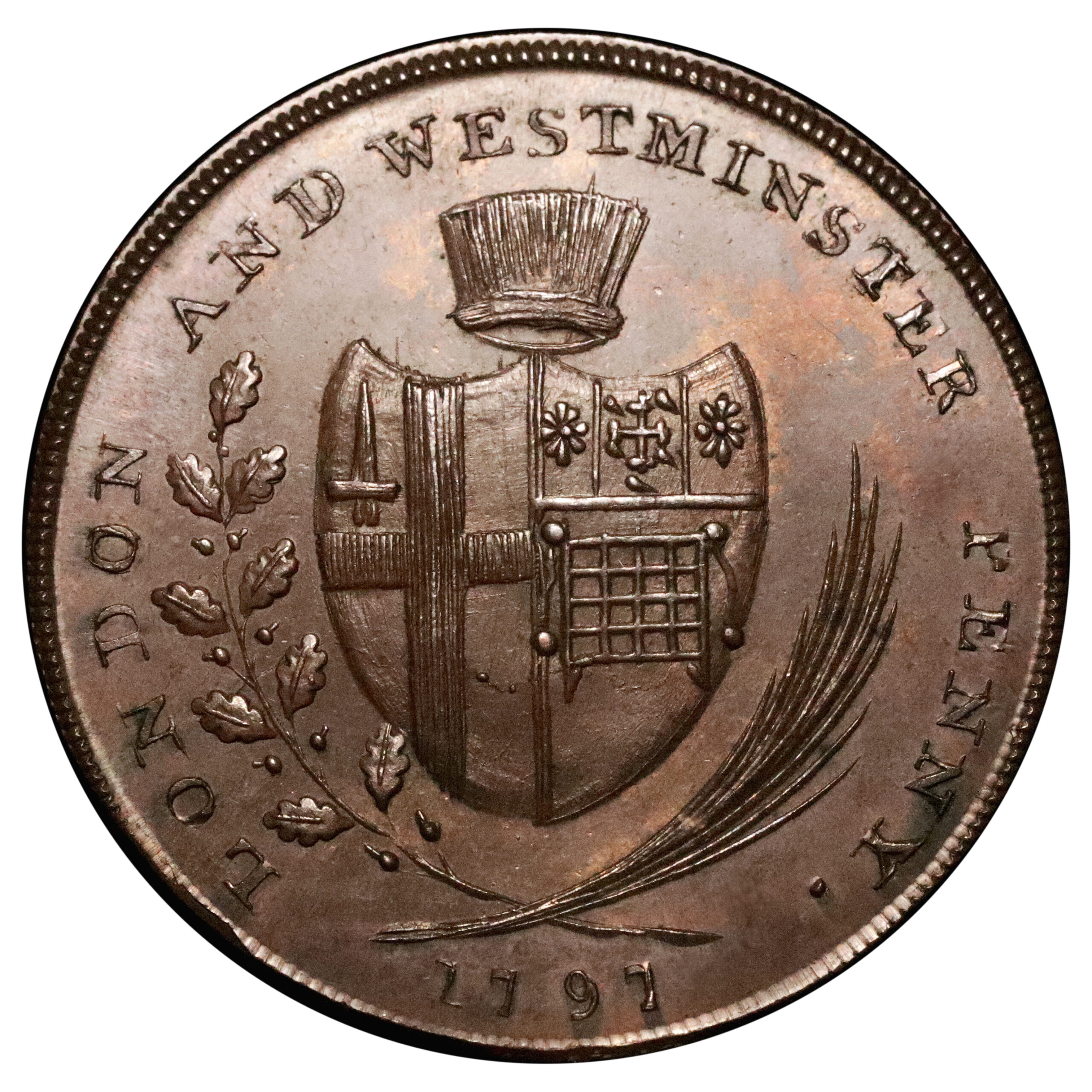 London, Session’s House; D&H 87, Prattent’s London & Westminster Series copper penny, 24.78g. Well struck with reflective chestnut brown surfaces and splashes of original colour. Rare, Extremely fine or better.