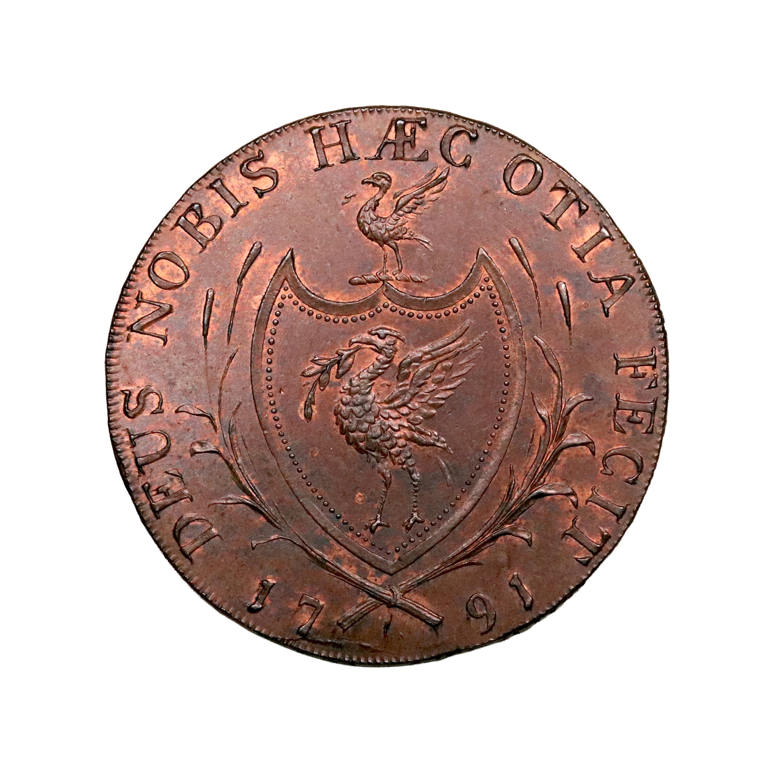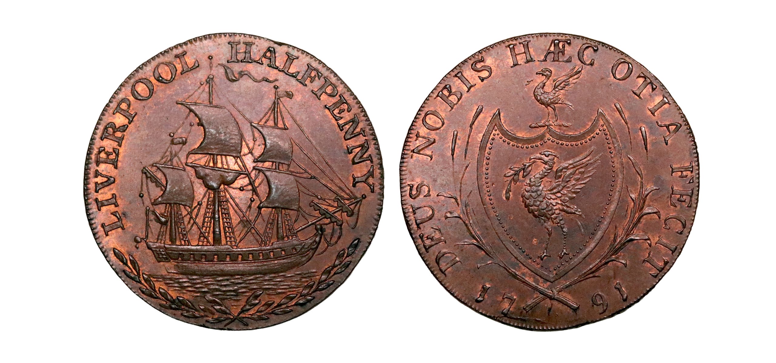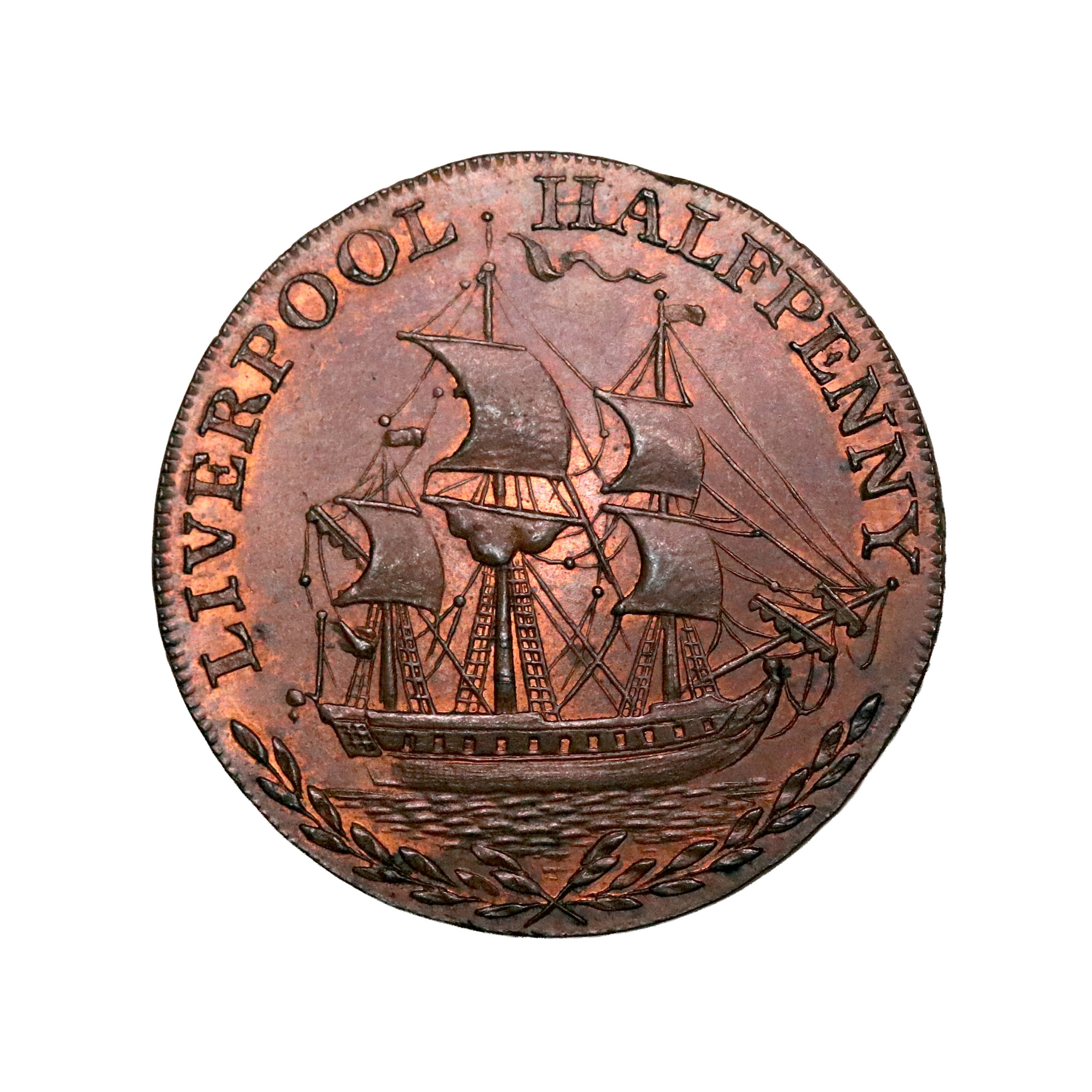 Lancashire, Liverpool, Thomas Clarke; D&H 88, halfpenny struck in copper. Sharp, with dramatic red almost as a sunset behind the sales. Wonderful eye appeal, good extremely fine or better.